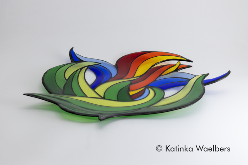 OverzichtDeze grote schaal is één van de mooiste die ooit uit ovens bij Glass & Art is gekomen. De heldere, transparante kleuren komen, gevat in glimmend opaak zwart, bijzonder goed uit. Als de zon erop schijnt, lijkt de schaal tot leven te komen! Het breedste punt is 60 cm.