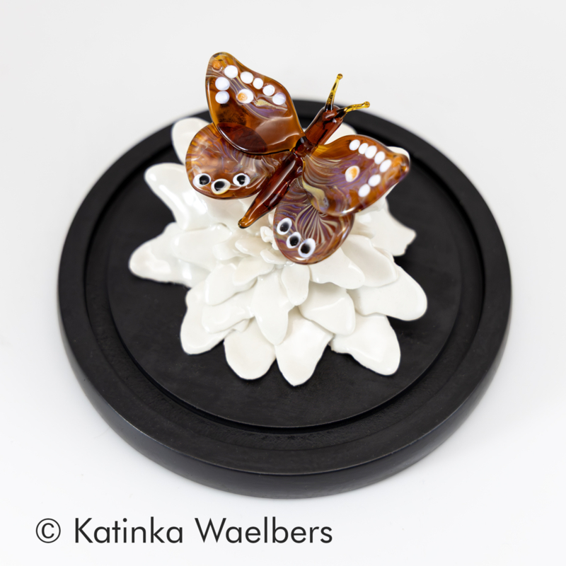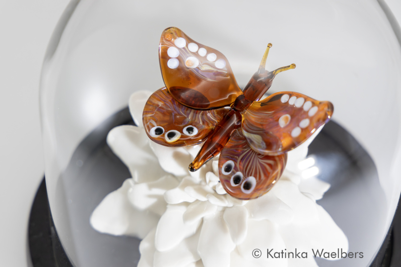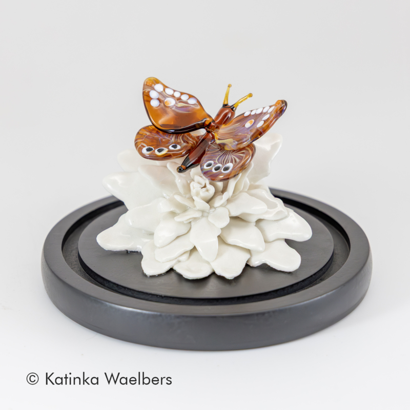 Onder een museale stolp is met glas en porselein dit unieke tafreeltje gemaakt: een levensechte glazen vlinder op een schitterende porseleinen bloem. Hoogte 14 cm