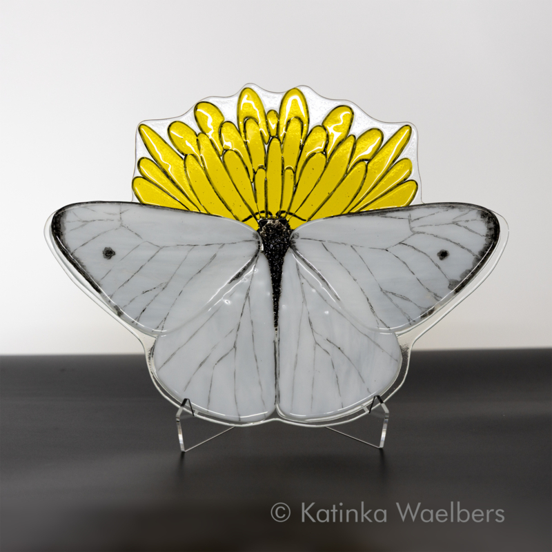 Glazen schaal: vlinder koolwitje op paardenbloem