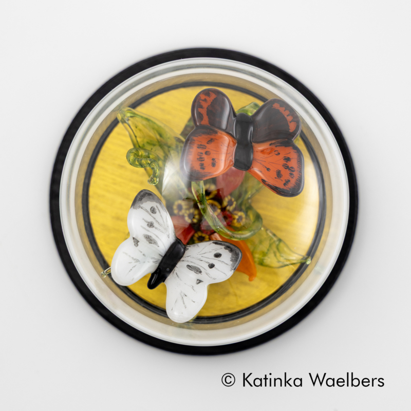 OverzichtOnder een museale stolp is met glas dit unieke tafreeltje gemaakt: een levensechte glazen vlinders op een schitterende glazen bloem. Hoogte 14 cm